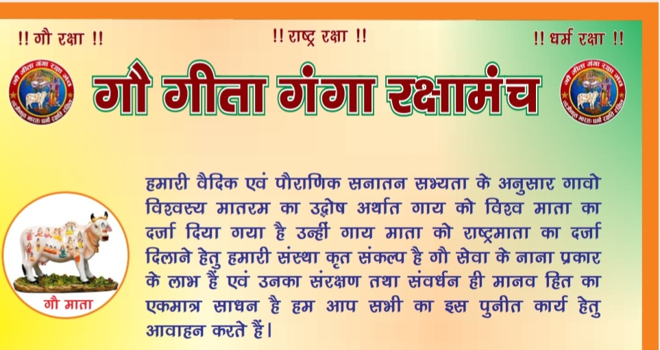 यह संस्था गैर राजनीतिक एवं गैर लाभकारी संगठन है इसका उद्देश्य गौ माता की रक्षा ,सेवा उपचार गीता रामायण, श्रीमद् भागवत महापुराण आदि सनातन धर्म ग्रंथ व संस्कारों का प्रचार प्रसार गंगा आदि पवित्र नदियों का निर्मली करण में सहयोग तथा जन जागरूकता अभियान चलाना पर्यावरण संरक्षण महिला सशक्तिकरण तथा धार्मिक ग्रंथो तथा जीवनोपयोगी शिक्षा हेतु कृत संकल्पित होकर कार्य करना साथ ही सभी पद तथा नियुक्तियां अवैतनिक होने के साथ-साथ अग्रिम आदेश तक ही प्रभावी होंगी और सदस्यता कार्ड का गलत इस्तेमाल करते हुए पाए जाने पर मंच द्वारा वैधानिक कार्यवाही की जाएगी इसके अलावा कोई आईडी कार्ड सिर्फ सदस्यता पहचान पत्र के अलावा हर जगह प्रभावहीन माना जाएगा । नोट: सदस्यता शुल्क वेवसाइड में दिए गए स्कैनर पर ही मा