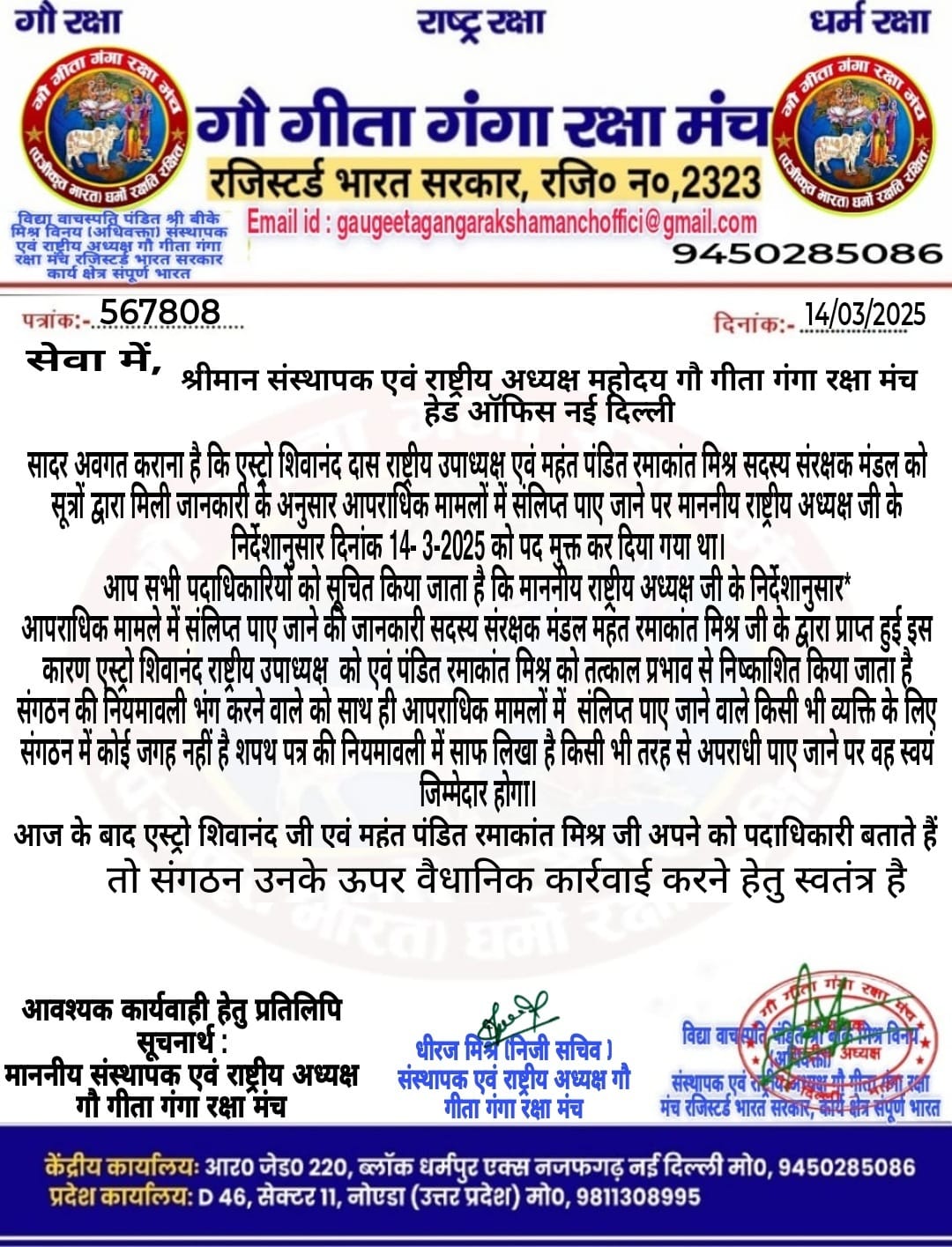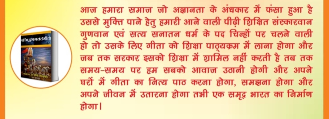 आवश्यक निर्देश : 1 : समाज के लिए तन मन धन से समर्पित होना चाहिए। 2 : पात्र के खिलाफ कोई भी मुकदमा न्यायालय में पंजीकृत ना हो। 3 : किसी भी तरह का अपराधी पाए जाने पर वह स्वयं जिम्मेदार होगा । किसी भी तरह की धनउगाही करते हुए पाए जाने पर कठोर कार्रवाई की जाएगी । 4 : गंगा स्वच्छ तो जनमानस स्वच्छ । 5 : गीता का ज्ञान घर-घर तक पहुंचाने हेतु एवं गौ संरक्षण व संवर्धन हेतु कृत संकल्पित रहना।