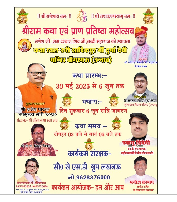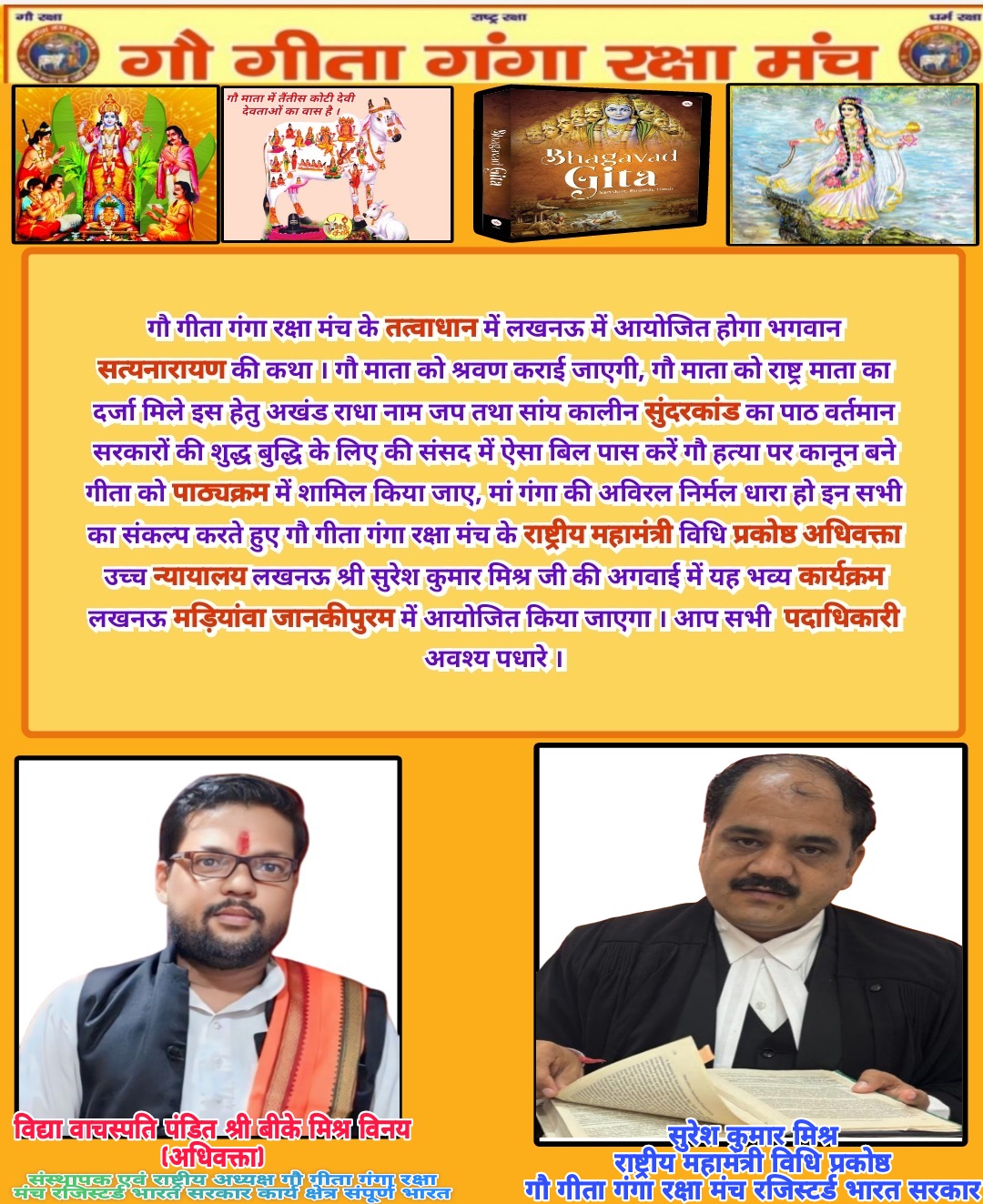 गौ गीता गंगा रक्षा मंच के राष्ट्रीय महामंत्री विधि प्रकोष्ठ अधिवक्ता उच्च न्यायालय लखनऊ श्री सुरेश कुमार मिश्र जी की अगवाई में होगा भव्य आयोजन।